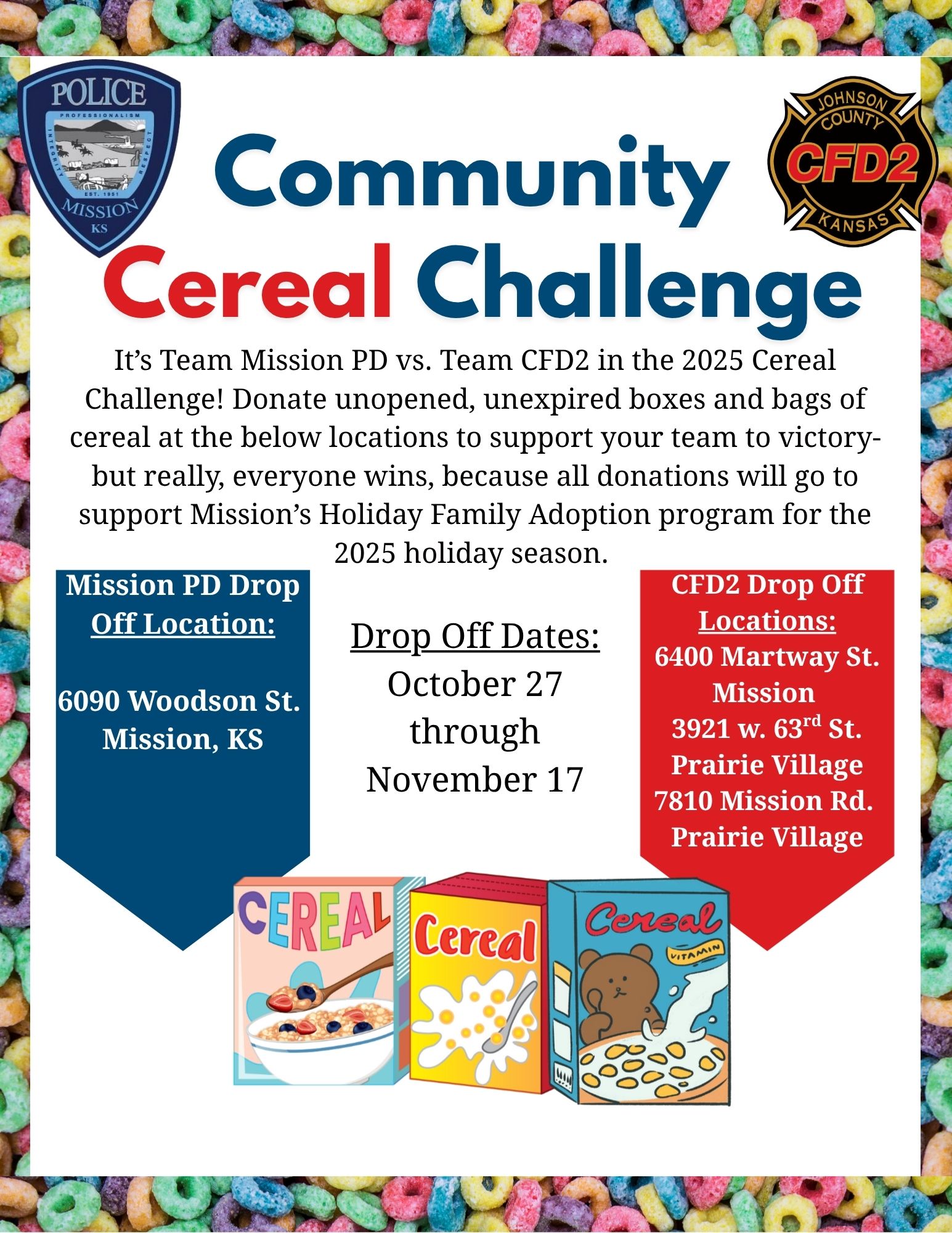 We’re going head to head with Mission PD to see who can bring in the most cereal to support Mission’s Holiday Family Adoption program. Drop unopened, unexpired boxes or bags of cereal at one of our three stations between October 27 and November 17 to help us pull our weight in this competition that benefits the community!